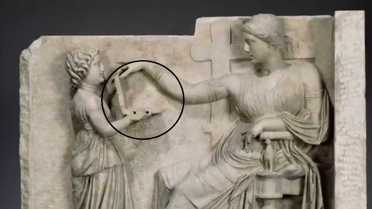 Uma escultura grega em alto relevo de cerca de 100 a.C, mostra uma jovem segurando um objeto que parece ser aberto em um ângulo direito para uma mulher distinta olhar. Ele é mantido no Museu J. Paul Getty, em Malibu, Califórnia, EUA, onde especialistas descrevem o objeto como uma caixa rasa.